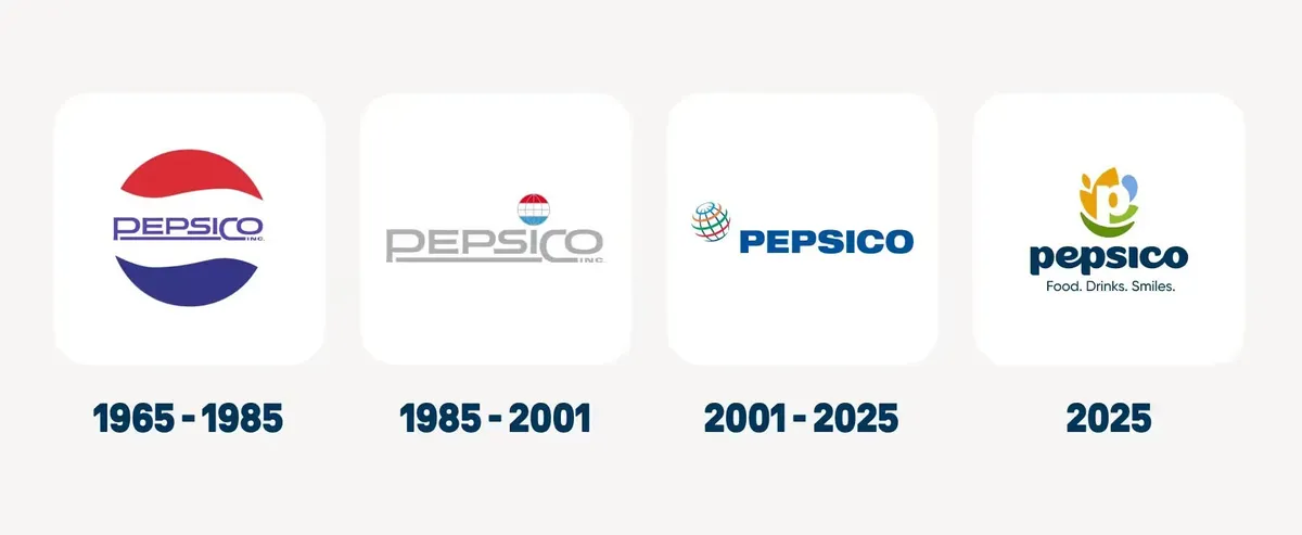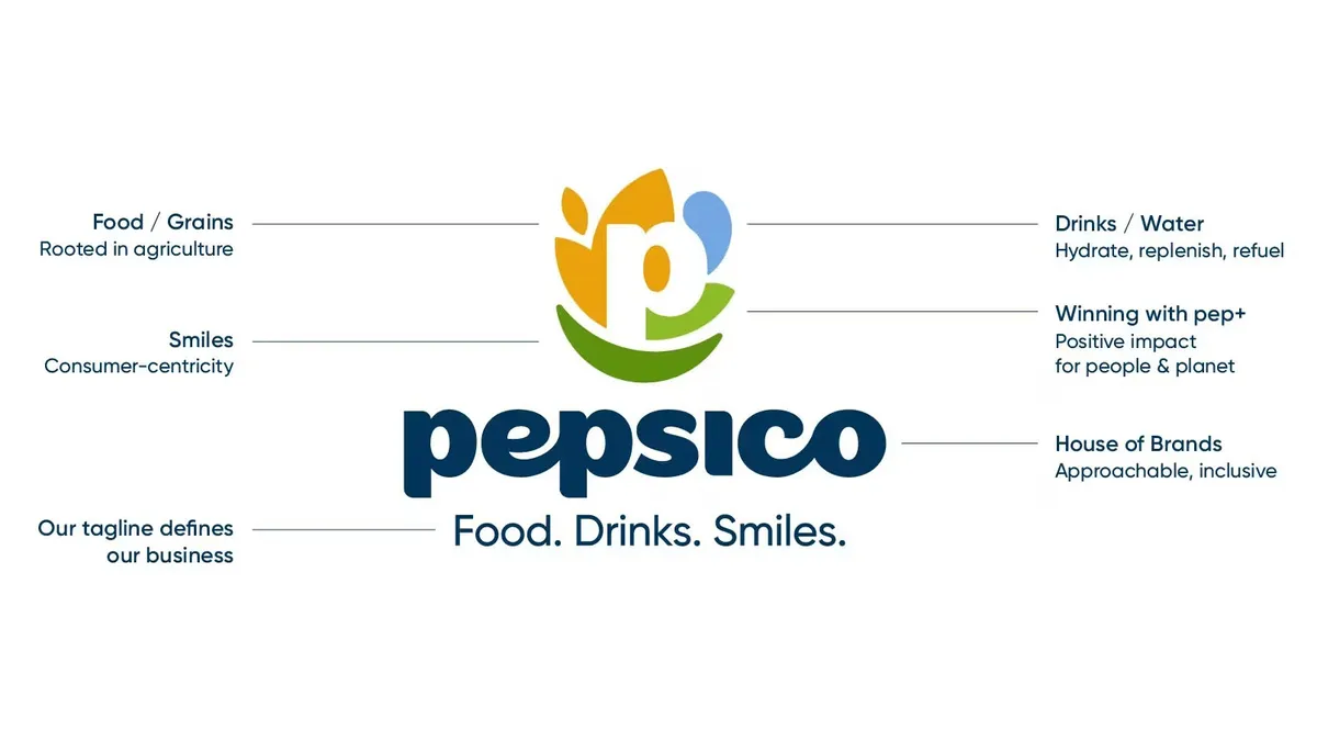 ペプシコはゲータレード、クエーカー、シエテ、そしてペプシなど500以上のブランドを傘下に抱える企業である。コーポレート・ロゴは約25年間にわたり地球儀風の円と大文字の「PepsiCo」で親しまれてきたが、今回、同社はコーポレート・アイデンティティを一新し、小文字に移行した新ロゴを発表した。パンチラインは「Food. Drinks. Smiles.(食品。飲料。笑顔。)」である。