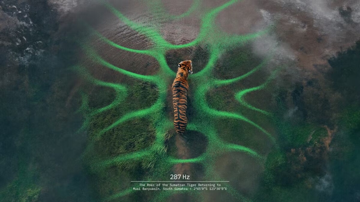 今回のクリエイティブ戦略の中心となったのは「音」である。フォレスト・カーボンは、再生した湿地林の現場で採取した生物音を基盤にしたブランドアイデンティティの構築を進めた。鳥のさえずりから大型哺乳類の鳴き声まで、多様な環境音を特殊な録音装置で収集し、そのデータを高速フーリエ変換(FFT)によって分析した。周波数と振幅を分解した音響データは、環境や生物群の特徴を示す“音の指紋”となり、ブランドのビジュアルを形づくる基礎となった。