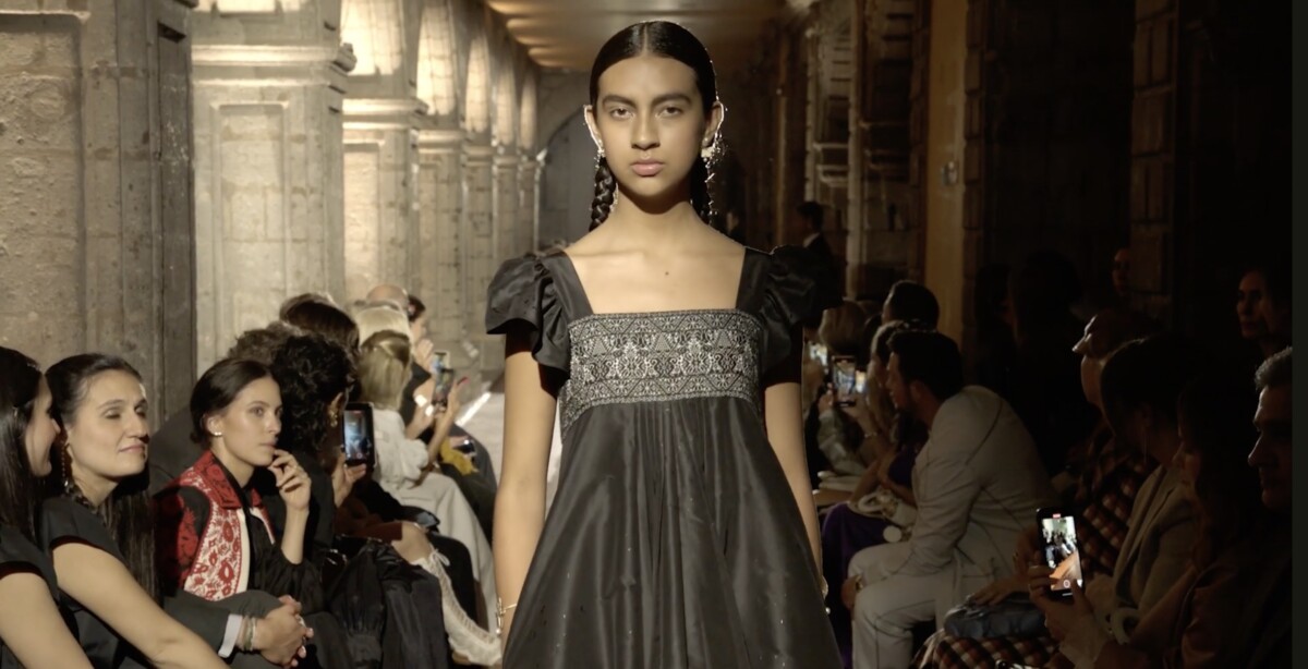 コレクションでは、プエブラの織り技法や刺繍が随所に取り入れられている。チュールドレスは織物素材によって刷新され、スクエアスリーブのトップスには手仕事の刺繍が施された。祖父母や曾祖父母の装いから着想を得た意匠は、現代的なシルエットと融合し、時間を横断する美意識を形づくっている。
