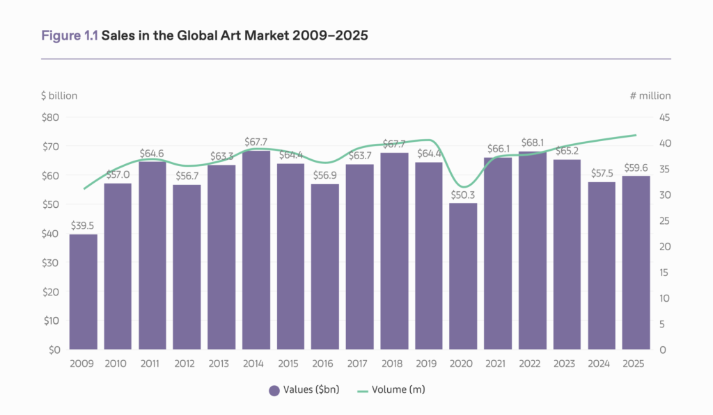 アートフェア「アート・バーゼル」と金融機関「UBS」が発表した年次レポートによれば、2025年の世界アートおよびアンティーク市場は緩やかな回復局面に入った。総売上高は前年比4%増の約596億ドルとなり、過去2年間の縮小から持ち直しを見せた。