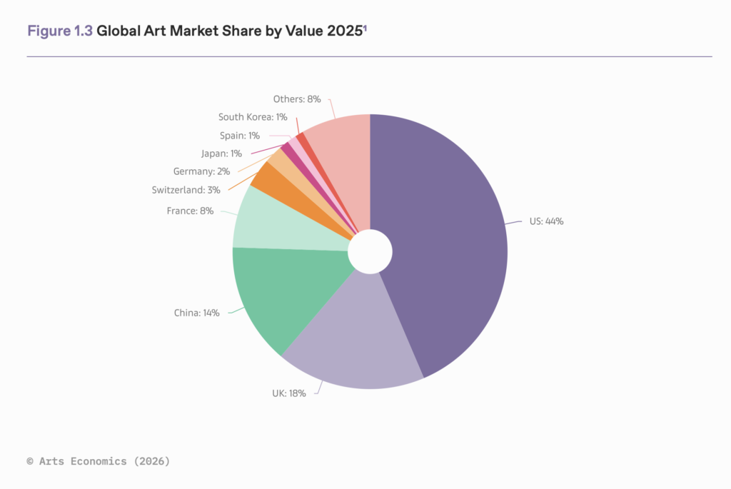 中国国内ではオークション市場が回復した一方で、国際色の強い香港市場は縮小した。アジア全体でも動向は分かれ、日本は前年比1%減とやや減速したのに対し、韓国は6%の成長を記録している。