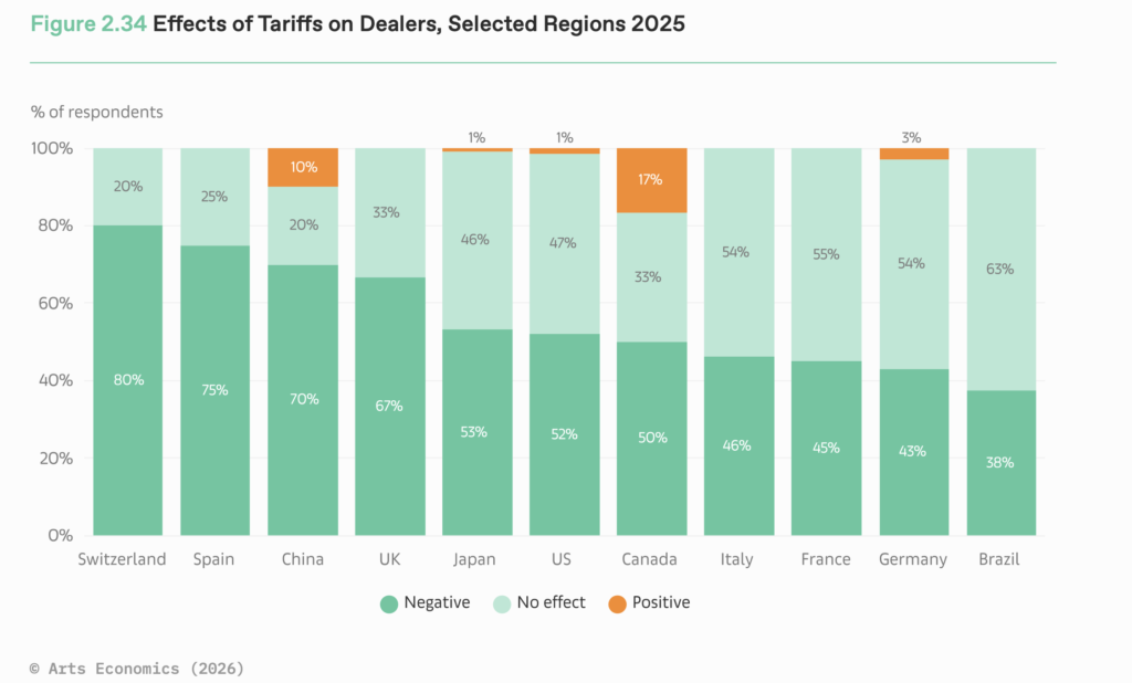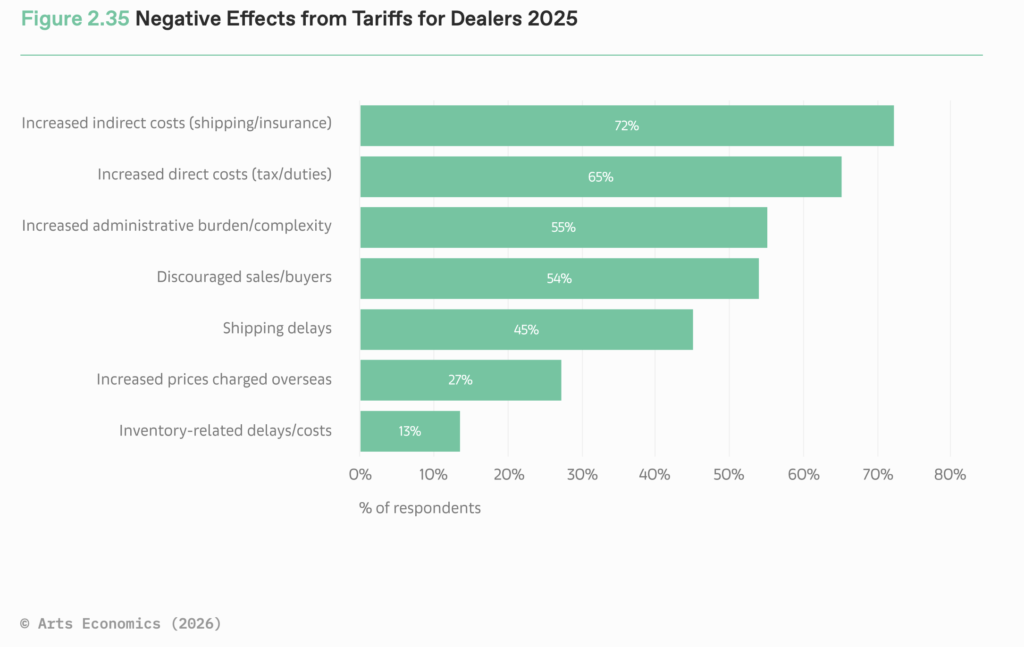さらに、アートフェア参加に伴う渡航費や出展費の上昇、間接費や運営コストの増加も深刻化している。これらのコストは前年から最も大きく増加した項目であり、中堅オークションハウスにとっても同様に主要な懸念となっている。(出典・画像:The Art Basel and UBS Global Art Market Report 2026)