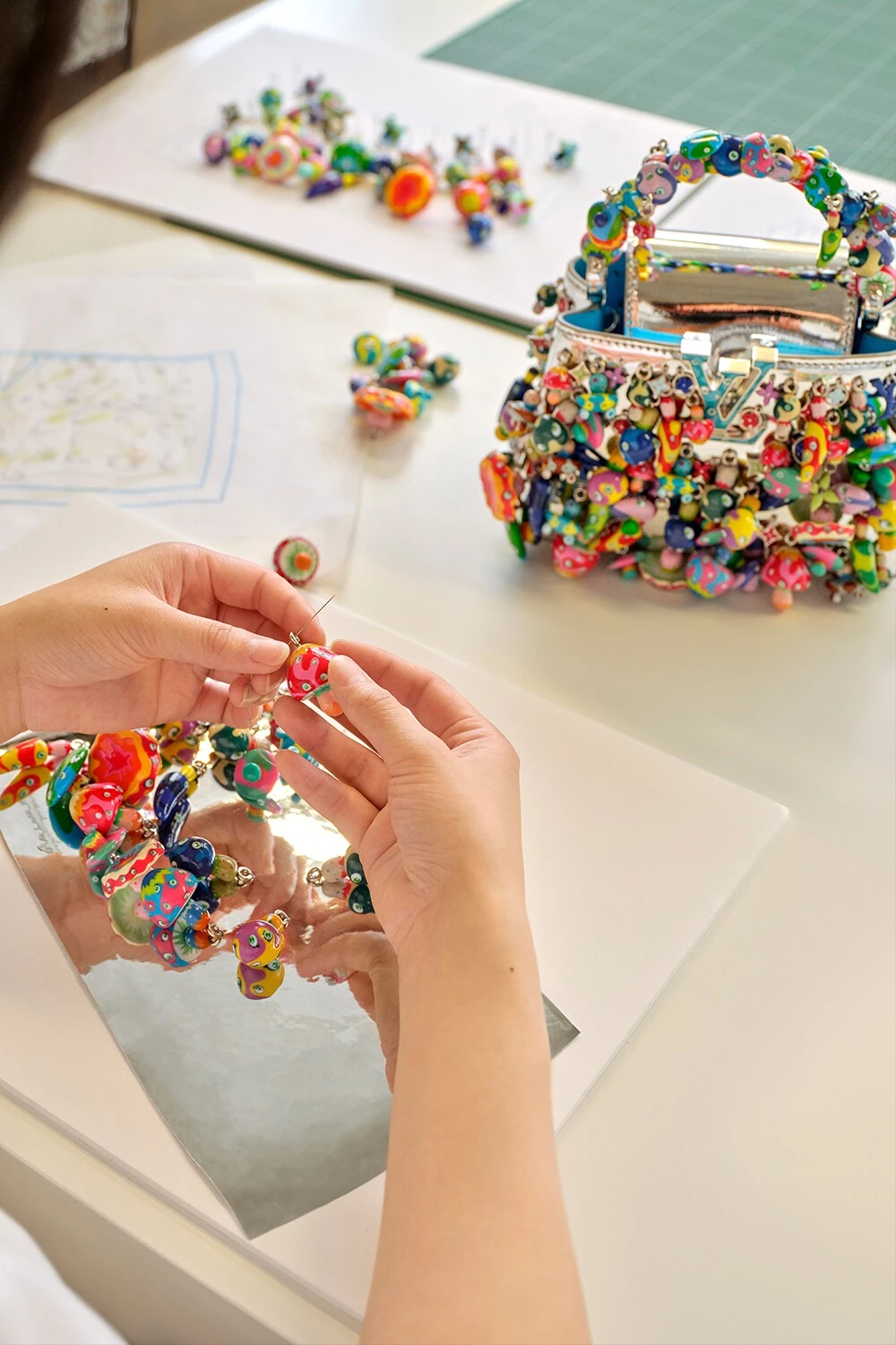 特に注目を集めたのは「カプシーヌ・ミニ・マッシュルーム」である。これは約100種類の3Dプリントによるキノコのキャラクターを手刺繍で装飾したバッグで、村上の遊び心と技術的な挑戦が融合した代表的な作品となった。